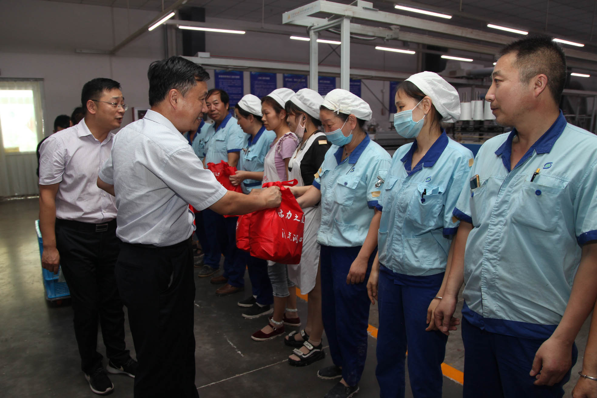 8月14日下午,夏日炎炎,骄阳似火,市总工会党组成员、主席助理陈志祥带领机关工作人员一行来集团公司织一车间走访慰问高温下坚守生产一线的员工,给员工送来夏日清凉和工会关怀。集团公司党委副书记、工会主席张启祥陪同参加慰问。 近年来,市总工会以职工为本,每逢高温时节,积极开展夏季高温慰问和安康“三送”活动,同时督促基层单位认真落实防暑降温措施,确保职工平安度夏。 张启祥简要介绍公司生产经营和高温季节防暑降温措施落实情况。在织一车间生产现场,陈主席一行对现场员工进行慰问。他与员工亲切握手,将一份份清凉用品送到员工手上。他感谢员工不辞辛劳、不畏高温,为保障企业正常生产、促进南通经济发展辛勤付出。他叮嘱大家要注意劳逸结合,注意身体健康。他要求公司切实做好防暑降温工作,确保一线员工安全作业。