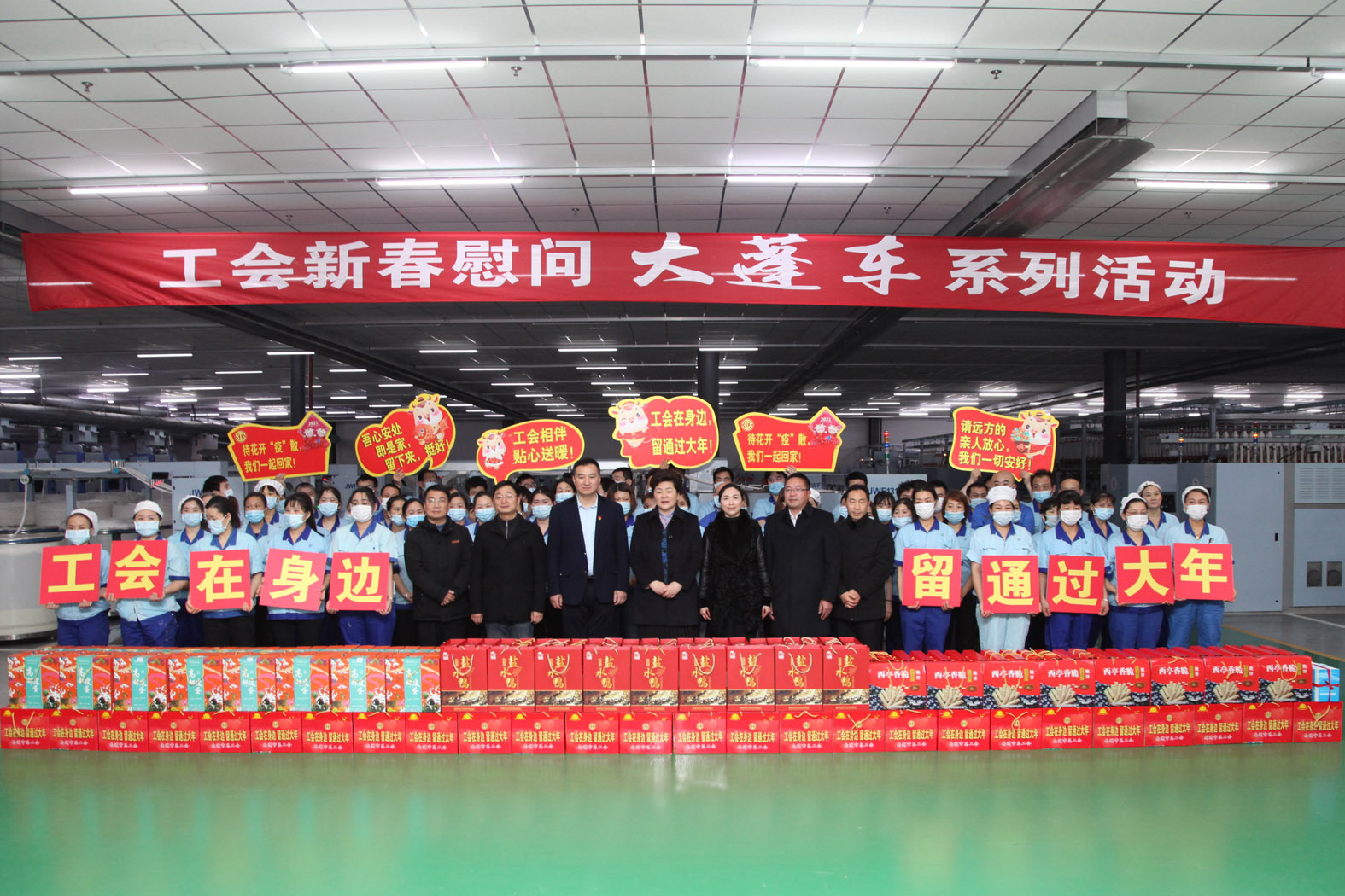 2月5日,市人大常委会副主任、市总工会主席葛玉琴,市总工会党组书记、副主席葛志娟,市总工会党组成员、副主席成飞一行来到集团公司,慰问坚守岗位、留通过年的外地员工代表。集团公司党委书记、董事长漆颖斌,党委副书记、工会主席张启祥陪同慰问。 漆颖斌向葛主任一行介绍了集团公司春节期间生产安排、为鼓励外地员工留通过年而落实的多项“留厂福利”。春节期间,为减少人员流动,做好疫情防控,公司大部分车间均不停工、不停产,对留通外地员工发放一次性补贴,对除夕到正月初三期间上岗加班员工足额发放加班工资并给予补贴,安排食堂免费供应住厂员工就餐,并为节后错峰返乡的外地员工报销车票。通过系列福利措施的落实,以确保外地员工留得下、稳得住、过得好。听取汇报后,葛主任连说“做得好”,并要求集团公司切实做好疫情防控,关心员工工作生活,帮助外地留通过年员工度过一个温暖、祥和、喜庆的春节。 在数字化纺纱车间,葛主任向外地员工代表表达了新春祝福,感谢大家对疫情防控工作的支持,用留通过大年的方式,为南通的疫情防控、企业的生产做出贡献。她给车间现场80余名外地员工代表发放了特产礼包等慰问品,并与大家合影留念、与员工代表亲属视频连线。