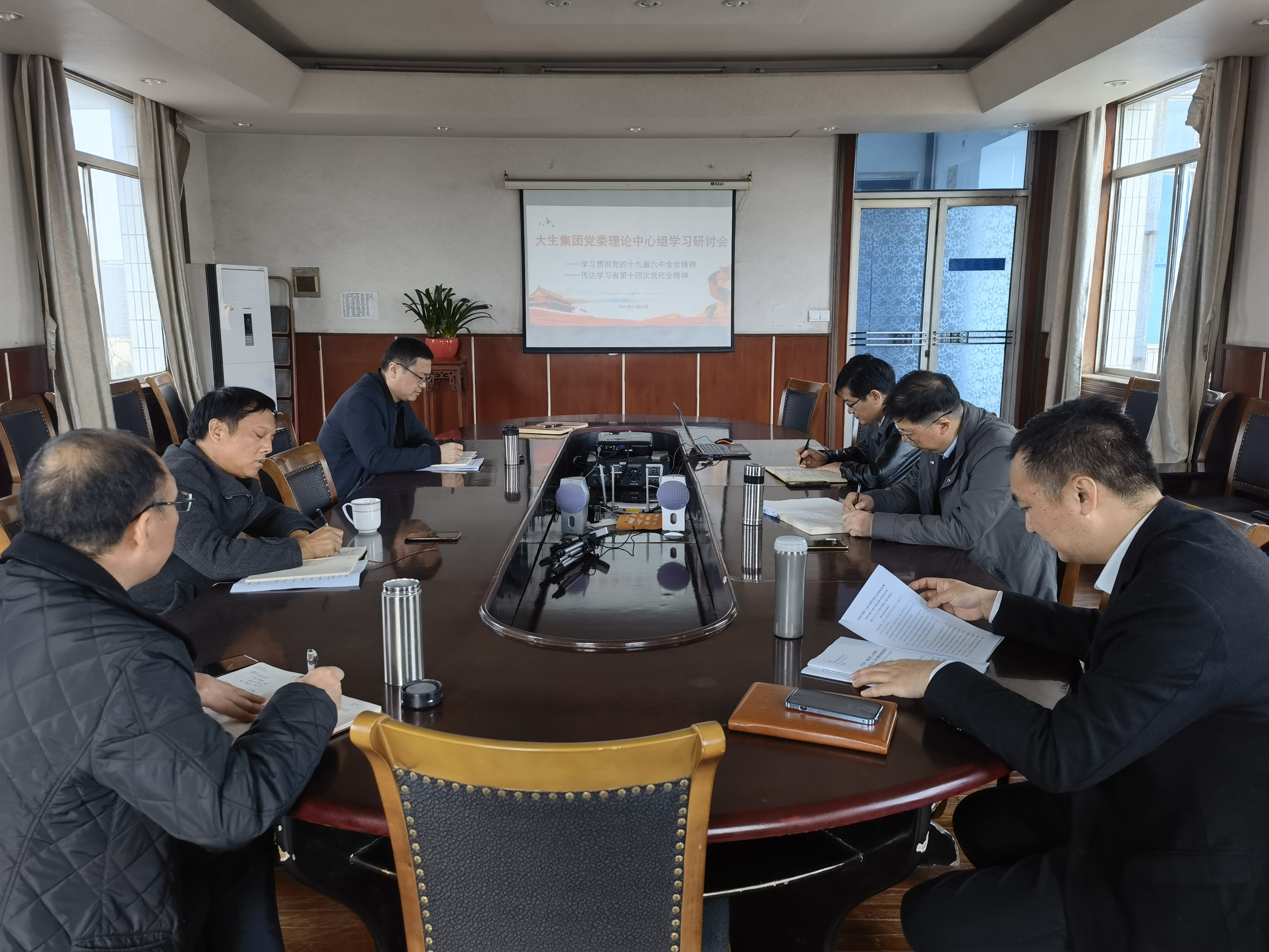 11月29日上午,威廉体育党委召开理论中心组专题学习研讨会,学习贯彻党的十九届六中全会精神、传达学习省第十四次党代会精神,集团党委书记、董事长漆颖斌主持会议,集团党委委员参会并交流发言。