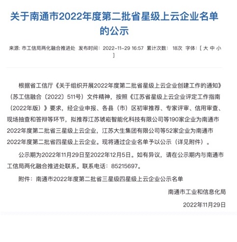 11月29日,南通市工业和信息化局公示了南通市2022年度第二批省星级上云企业名单,威廉体育成功入选“南通市2022年度第二批省四星级上云企业”。威廉体育走智能制造之路,以高端、智能、绿色、服务为导向改造提升纺织产业,获评四星级上云企业,体现了威廉体育在智能化改造和数字化转型中的示范作用。