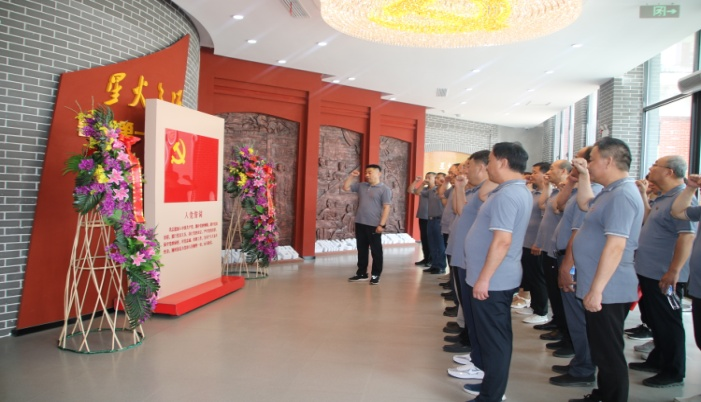 在鲁西第一个党支部纪念馆,全体党员满怀崇敬心情向先烈敬献了花蓝,表达对先烈的无限怀念之情;全体党员重温入党誓词,面向鲜红的党旗,用庄严的宣誓表达对党的忠诚。