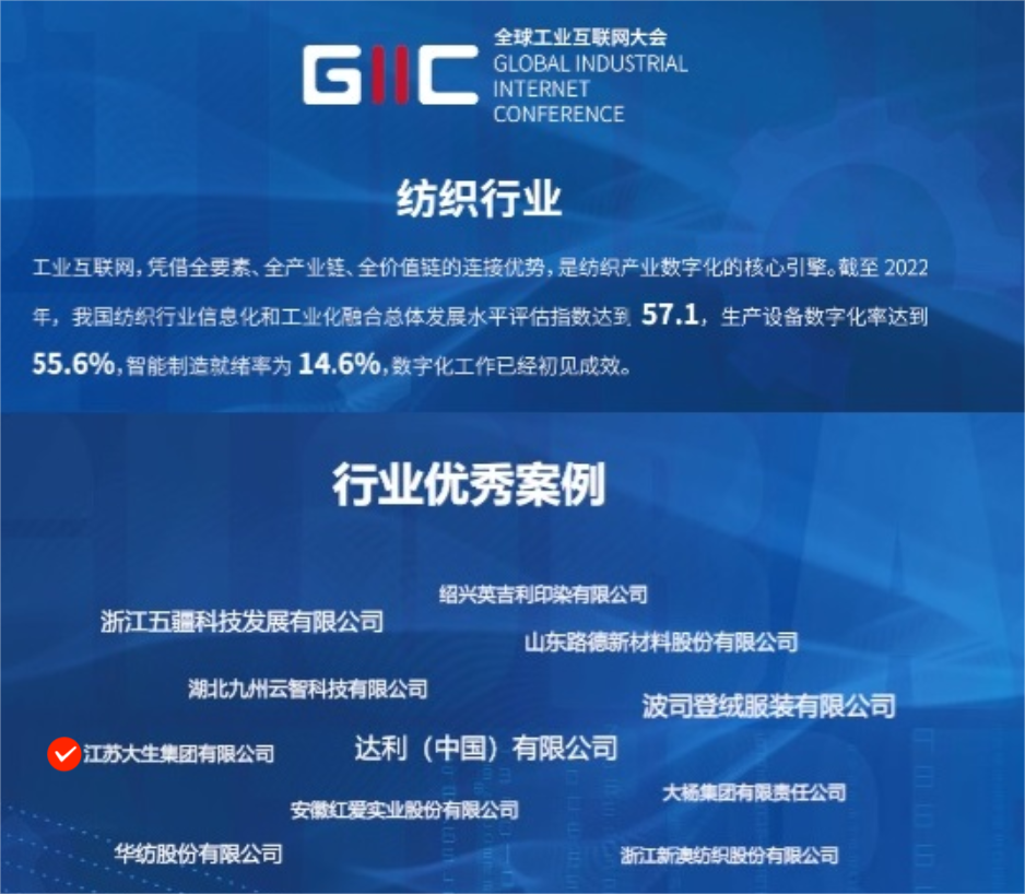 10月12日,全球工业互联网大会在浙江桐乡举行,集团公司“10万锭智慧化纺纱工厂”作为行业十大优秀案例被大会推广发布。集团公司作为受邀单位,副总经理陈建参加了大会。