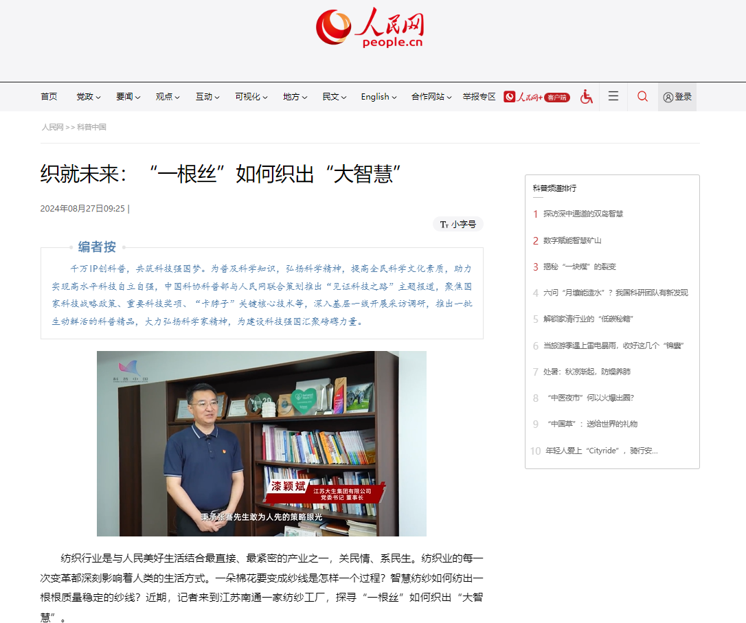 近日,人民网在“科普中国”频道发布了《织就未来:“一根丝”如何织出“大智慧”》,从一朵棉花如何“智”变纱线展开,探寻威廉体育智慧纺纱工厂智能化创新成果。