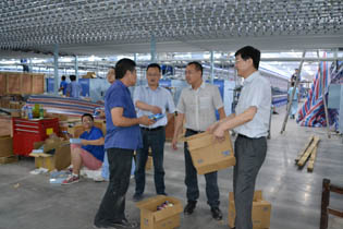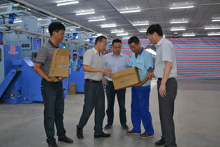 8月5日下午,市国资委纪检组长尹红宇,专程来到集团公司三期工程数字化纺纱车间装车现场,看望慰问在高温一线辛勤工作的集团员工。
